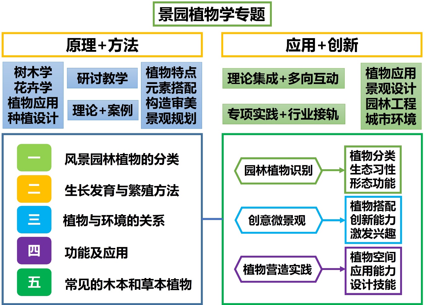 植物是园林景观中重要的造园要素,能够美化环境、营造佳景,如何充分发挥植物的作用、解决造园中存在的问题,是风景园林设计中值得深思的问题。教学内容围绕风景园林植物的分类、发育与繁殖方法、植物与环境的关系、功能及应用、常见的木本和草本植物等方面讲述,使学生了解园林植物资源特点、观赏特性、生态习性、形态及功能等,并且能够掌握不同类型园林景观中植物的特征、识别并运用常见的园林植物。课程结合园林树木学、花卉学、园林植物应用、种植设计等理论基础知识与案例串联讲授,将风景园林植物的理论知识应用到植物景观配置和景观规划中,使学生能够将其与造园元素合理搭配,形成特定空间、构造视觉美和意境美兼具的功能性园林景观,培养学生掌握景园植物学的基本原理与方法、具有独立解决园林植物应用问题的能力,为后续专业课程的学习和职业素养的提升奠定基础。