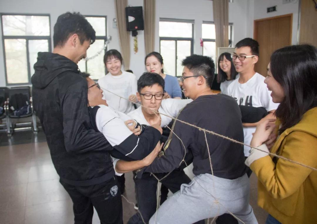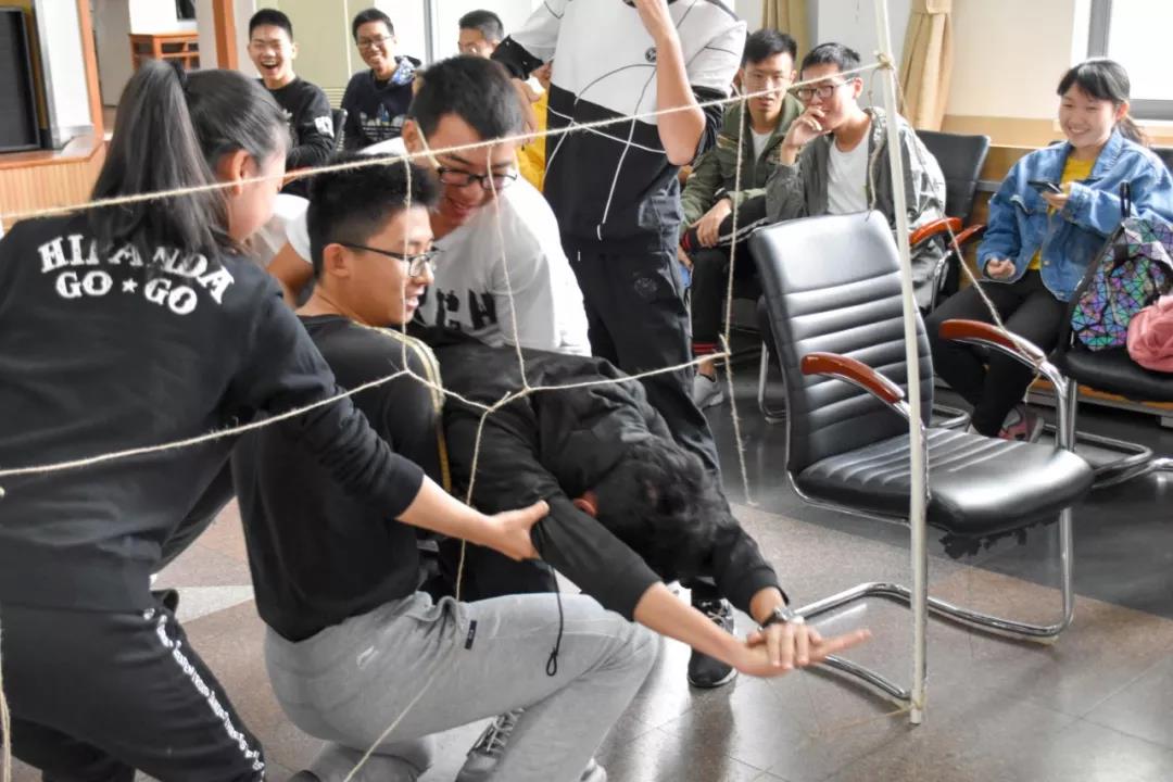 经历了动手的齐眉棍后,大一小萌新们迎来了更具挑战性的项目:穿越电网。面对网格数并不多且高度不一的绳网,队员们在队长的带领下快速讨论分配及运送队员的方法,尽管各种穿越方式创新不断,但队员们互相帮助互相保护的协作精神却体现得淋漓尽致。