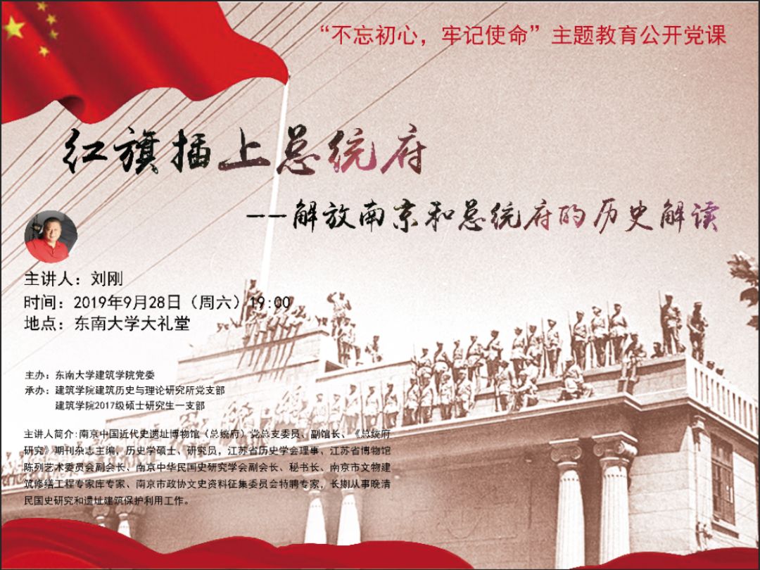 2019年9月28日晚,由香港赛马赔率|查询平台|赛果数据 党委主办,建筑历史与理论研究所党支部和2017级硕士研究生一支部承办的“不忘初心,牢记使命”主题教育公开党课在香港赛马会赔率 四牌楼校区大礼堂举行。南京中国近代史遗址博物馆(总统府)党总支委员、副馆长刘刚研究员以《红旗插上总统府——解放南京和总统府的历史解读》为题,为香港赛马会赔率 500余名师生党员和入党积极分子上了一堂生动的党课。此次党课面向全校师生开放。香港赛马会赔率 党委书记冷嘉伟教授主持党课。他指出,在举国上下喜迎建国70华诞之际,开设“不忘初心,牢记使命”主题教育公开党课具有特别的意义。他强调,全体党员要牢记初心,勇担使命,把主题教育作为深入学习贯彻习近平新时代中国特色社会主义思想的重要抓手,按照“守初心、担使命,找差距、抓落实”的总体要求,将学习教育、调查研究、检视问题、整改落实贯穿主题教育全过程,为加快香港赛马会赔率 “双一流”建设、实现“1-10-100”的“东大梦”和中华民族伟大复兴的中国梦凝心聚力、共同奋斗!