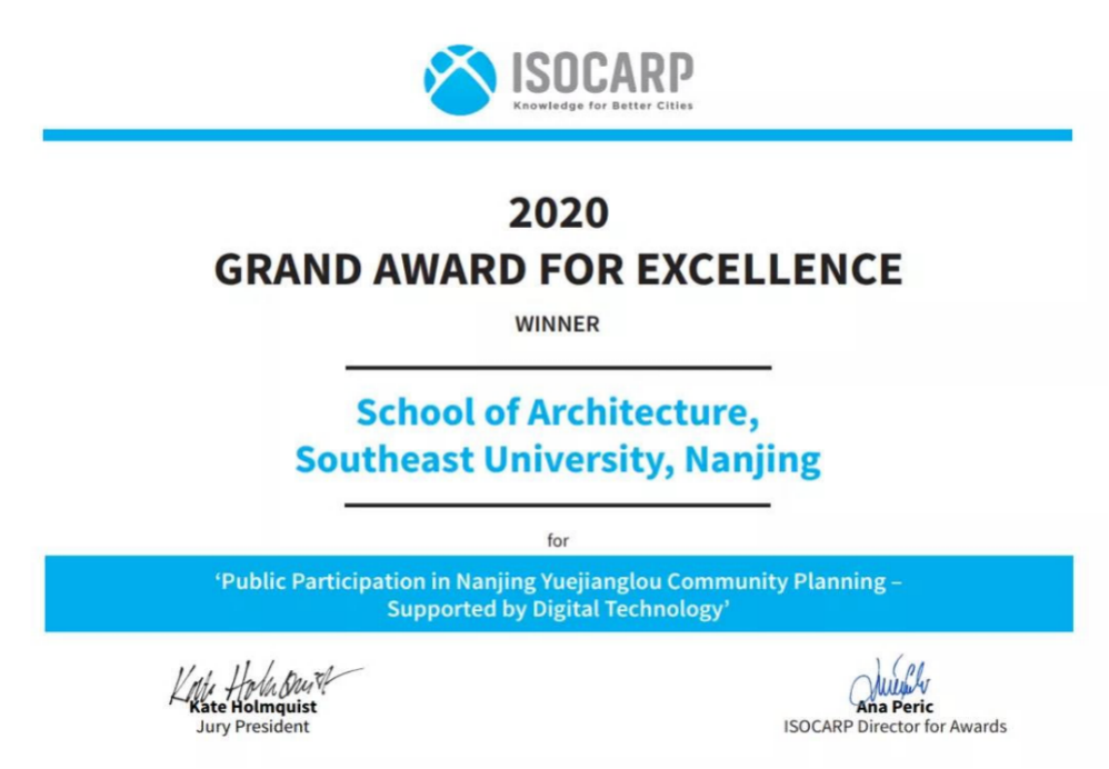 上述专利技术的实践应用,实现了公众意见的智能识别、公众参与的智能设计、设计过程的智能管理,曾在2020年获得了ISOCARP卓越设计大奖。