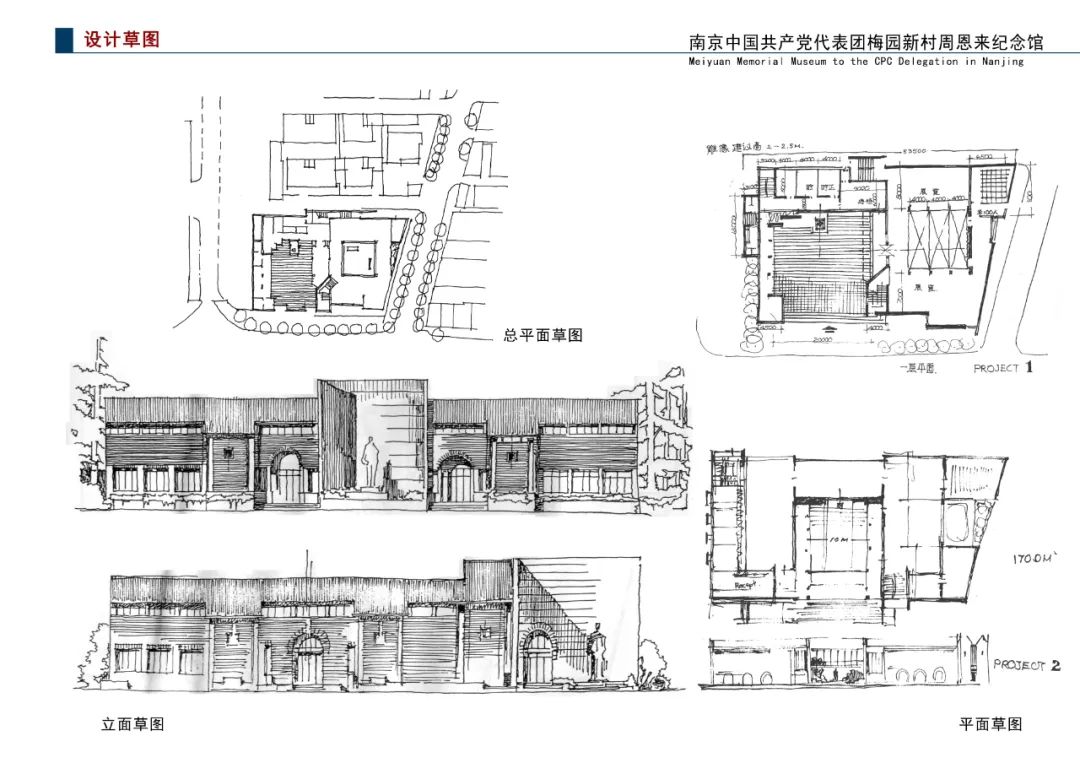 建筑研究所接到委托,与南京市建筑设计院合作,承担中国共产党代表团梅园新村纪念馆设计工作。由齐康院士带队,许以立、孟建民、曹斌、仲德崑共同参与设计。项目于1991年建成,工程规模2400平方米。纪念馆通过与周围建筑环境的和谐,使历史环境中的事迹得到建筑艺术上的再现,肃穆静思的氛围呈现出特定的历史意义。从内庭院到展厅,再下到梅园新村30号周恩来同志故居,全馆1170件珍贵文史资料,生动展现了老一辈无产阶级革命家的崇高精神和革命风范,突出反映了老一辈无产阶级革命家的革命业绩。透过一页页鲜见的文献档案,一帧帧珍贵历史图片,可以直观地感受到中国共产党人不忘初心、坚守信仰、永远奋斗的精神风貌。