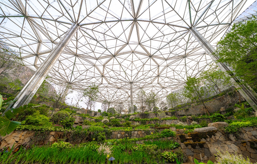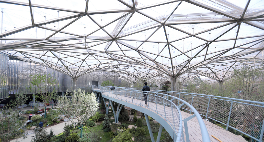 江苏园博园未来花园植物园的水下亚克力屋面创意新颖,无参考案例,无同类项目设计经验,中国院帷幕中心立足技术本身,联合众多顶级高校及科研团队,解决项目的各类难题,研究成型技术、安装技术;设计巧妙地连接结构与不锈钢伞状柱安全连接,同时解决膨胀伸缩、防水、防冰涨、上下水、清洁排污等各项技术难题。高实现度完成设计创意,让植物园的屋面成为未来花园的灵魂。扩展应用于雄安站的无痕标识技术和无构成型的透明小房子,以上实践将亚克力结构的发展前景提上一个新的高度。