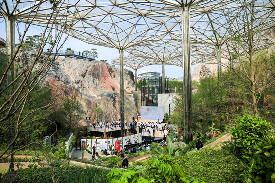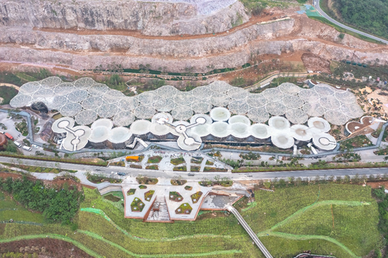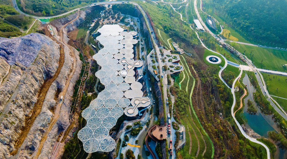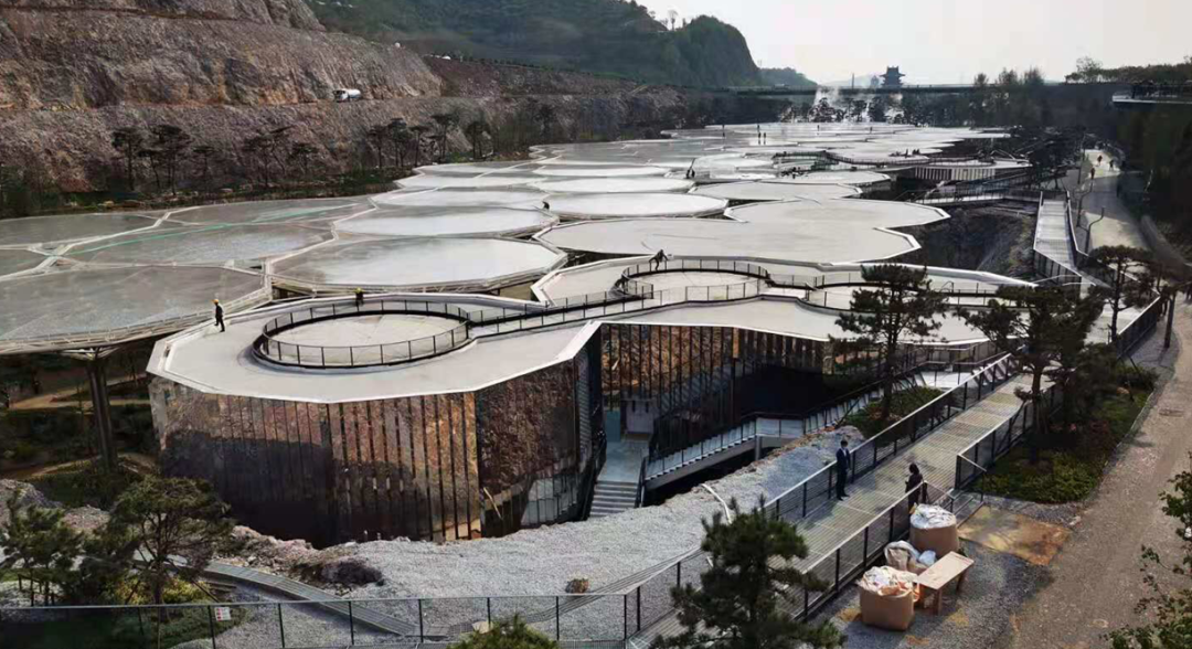 “未来花园”项目选址是一个长达1.1公里,最深达30米的超尺度孔山矿坑遗存,设计团队最大限度保留了崖壁和矿坑以减少开发对场地生态的破坏。将大面积雾森景观与矿坑的特殊环境相结合,在坑底制造出飘渺的云雾,亦真亦幻似“云池”。为了实现对矿坑特殊岩壁的利用,未来花园的悦榕庄酒店及剧场采用了钢结构将建筑架空于矿坑之上,最大限度地减少对矿坑植物的破坏,与保留的崖壁形成对话。该项目最具亮点的是创新性地采用大面积有机玻璃蓄水屋面覆盖整个植物花园,把直径21m的不锈钢树状柱单元支撑起1.6万平米的有机玻璃无缝屋面水池,施工克服了温度和应力变化的安装困难,实现了有机玻璃现场高效安装与本体聚合,还给矿坑一汪清池,给植物园带来水下光影的奇幻体验。