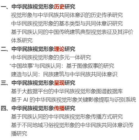 中华民族视觉形象 呈现研究 | 建筑学、城乡规划学、风景园林学、民俗学、美术学、大数据人工智能与图像识别相关专业,主要从事民族视觉形象的发掘、整理、智能识别与数据库建构。参与本方向重要课题研究,或独立申报、开展高级别课题研究,撰写发表高水平论著或智库成果。 |
