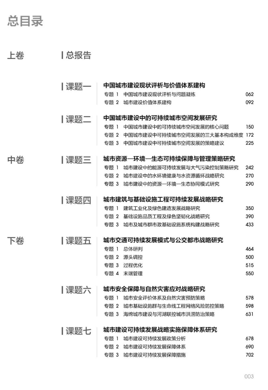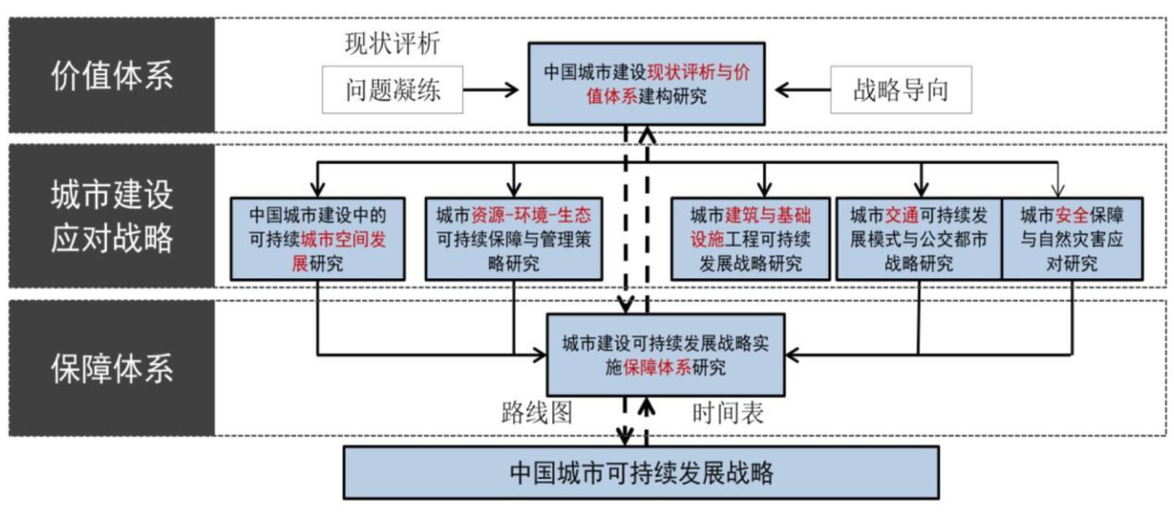 这七个课题按照“现状评析-问题凝练-价值建构-应对战略-保障体系”的思路进行设置。课题一、七分别在总体构架上开展中国城市建设现状评价和价值体系建构、城市建设可持续发展战略实施保障体系的研究,组成项目研究首尾相顾的内容逻辑闭环,并通过课题七在制度体制创新方面提出总体建议,这是整个研究能否落实的重要保障。课题二到课题六则分别从城市空间发展、资源-环境-生态保障和管理、城市建筑与基础设施工程、交通发展模式与公交都市、城市安全与自然灾害等方面开展了相关研究,从问题剖析、价值评判到技术策略和实施建议,形成各自的发展战略成果。27位院士率领研究团队经过两年多的研究,完成了本研究由三大体系构成的咨询成果:基于世界可持续发展基本共识框架、传承中华优秀文化、回应当代科学技术前沿变革导向的中国城市建设可持续发展的价值理念体系,城市建设可持续发展相关的典型专业领域发展战略体系和城市建设可持续发展战略实施保障体系。当下,中国城镇化正在从依靠土地和人口资源红利的规模外延扩张到内涵品质提升、依靠创新发展和产业转型、增量和存量共存并逐渐趋向存量为主的城镇化发展新模式。为此,本项目的研究成果将为中国城市可持续发展这一新的战略转型提供系列的重大相关决策参考。