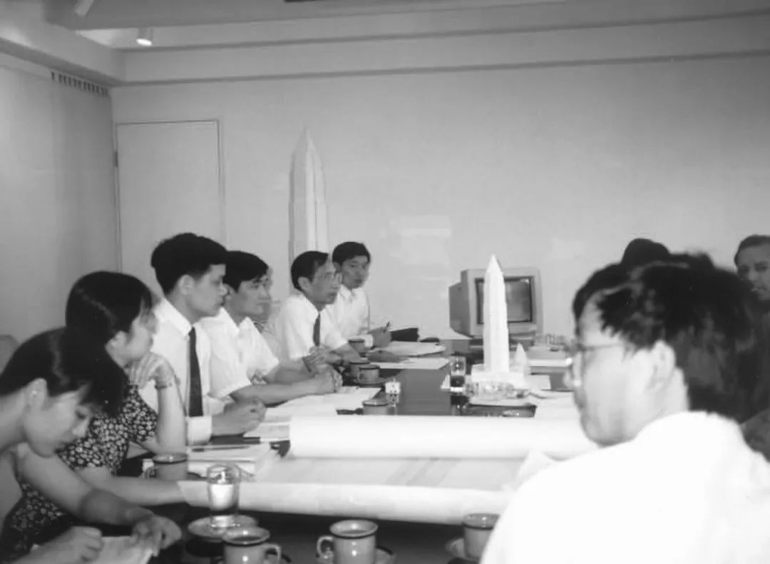 1994年,与香港P&T公司合作设计南京同仁大厦。图为设计组在香港P&T公司讨论设计方案,左五为沈国尧。