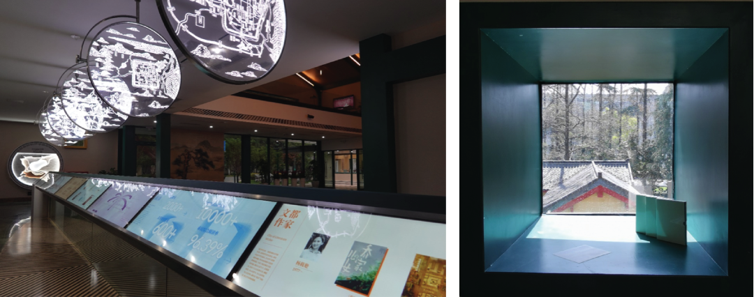 走进建筑内部,高敞空间与文脉展示合二为一,可坐可游的大台阶引领观者逐一欣赏每一处开窗透进的不同景致,在不同文学题材的联想中感受文学客厅营造的内外交融的典雅情境。