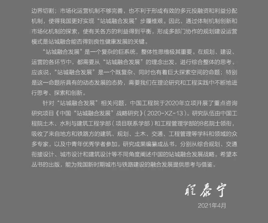 为此,中国工程院于2020年启动了重点咨询研究项目《中国“站城融合发展”战略研究》。研究团队由中国工程院程泰宁院士和中国国家铁路集团公司郑健总工程师领衔,联合中国工程院土木、水利与建筑工程学部,工程管理学部的8位院士及近90位各领域专家共同组成。