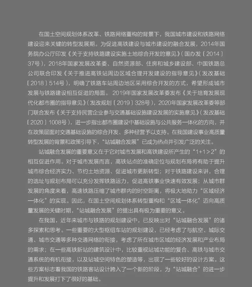 随着高铁网络的广泛覆盖,高铁车站建设与城市发展的关系日益密切。铁路车站与城市及周边地区融合发展可以促进城市的更新转型,带动沿线经济转型发展, 激发城市活力,目前已成为我国城市建设的强烈诉求。然而,从已建成的铁路枢纽来看,由于城市建设与铁路网络建设的协调不够充分,铁路与城市融合发展的效应未能得到充分发挥,站城矛盾也日益凸显。主要包括:城市规划与铁路枢纽规划的协调不够充分,铁路枢纽与城市交通衔接不协调,乘客出行不便;车站地区公共空间和功能空间的布局不够合理,铁路客站空间与城市综合服务功能集成度不高;建筑设计、管理运维综合评价标准不适应站城融合发展的需要,铁路枢纽建设的综合效益不佳;站区土地综合利用率不高、机制不完善等,影响和限制了城市建设的发展。