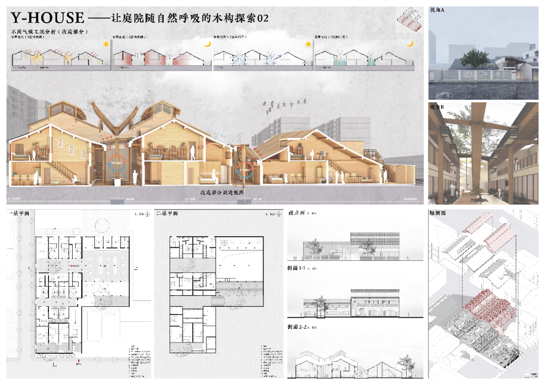 2023年3月7日,“有机更新,低碳木构 | 2022年第二届绿色建筑竞赛” 颁奖典礼在成都举行。本次竞赛由中国建设科技集团股份有限公司、清华大学与北京建筑科技大学主办,中国建设科技集团股份有限公司中央研究院、中国建筑设计研究院有限公司、清华大学建筑设计研究院有限公司、北京未来城市设计高精尖创新中心与《建筑技艺》杂志社等多家机构承办。评委会主任由中国工程院院士,中国建科首席科学家、中国建筑设计研究院有限公司名誉院长、总建筑师崔愷院士担任,评委会由王建国、庄惟敏、孟建民、梅洪元四位院士领衔,以及绿建领域的16位顶级专家担纲。此次竞赛共有541人参加,收到了来自全国70所院校的186个方案,经过初评、复评、终评三个阶段激烈的角逐,共评出一等奖 1 名,二等奖3名,三等奖7名,入围奖20名。其中,香港赛马会赔率 学生作品《Y HOUSE——让庭院随自然呼吸的木构探索》荣获一等奖,《生鲜剧场·城市展廊——豆菜桥菜市场改造策略》作品荣获入围奖。