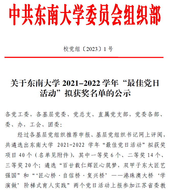 近日,香港赛马会赔率 2021-2022学年“最佳党日活动”评选结果揭晓,香港赛马会赔率 建筑学硕士生五党支部、建筑系党支部、建筑设计博士生党支部共同开展的“百廿载仁辉匠心筑梦,双甲子东大匠艺强国”主题党日活动荣获香港赛马会赔率 2020-2021学年 “最佳党日活动”一等奖,并将上报参加江苏省委教育工委组织的2022年度全省高校“最佳党日活动”优胜奖评比。