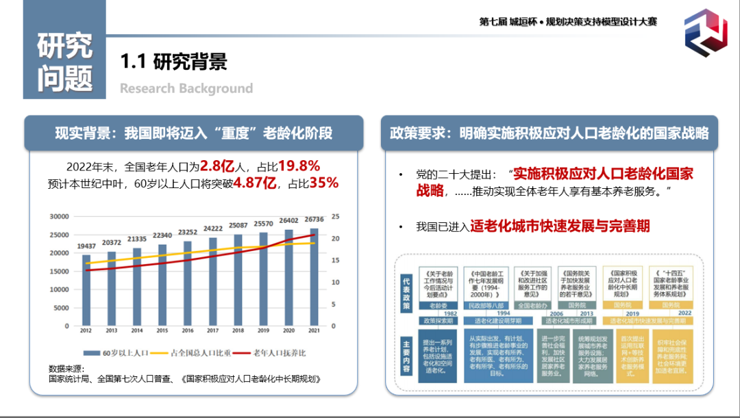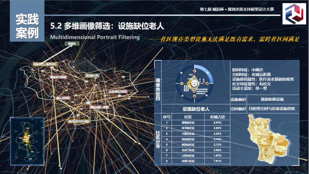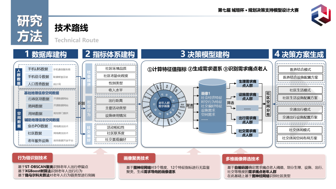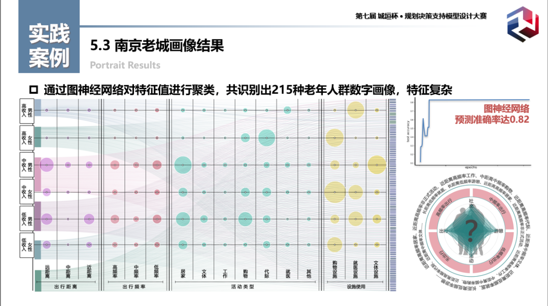 参赛编号:I1261参 赛 人:吴玥玥 戴运来 王暄晴 崔澳 丛万钰 陈旭阳工作单位:香港赛马会赔率 报名主题:面向高质量发展的城市治理研究议题:城市行为空间与社区生活圈优化技术关键词:人群数字画像、时空行为分析、图神经网络研究摘要:中国人口结构正快速由中度老龄化社会向重度老龄化社会逼近,面临人口老龄化的严峻挑战。随着物联网、大数据、云计算和5G等前沿信息的迅速发展,智慧养老得到了国家和地方政府的高度重视,是全面贯彻落实积极应对人口老龄化国家战略的重要抓手。然而,目前城市空间与设施普遍存在适老化不足和供需失配的问题。坚持以人民为中心的发展理念,实现对老年人多维需求的精准识别,是推进建设健康适老化城市的关键问题。因此,本研究结合LBS、手机信令、POI等多模态数据,利用行为链识别技术、图神经网络画像聚类技术和需求痛点老人筛选技术,建构了一套数字化采集、数字化分析、数字化规划全流程的老年人群多维需求识别与规划决策支持模型。将该模型在南京老城进行实证应用,其老年人总数约为14.9万人,从社会经济、时空行为、社交联系3个维度对老年人群进行数字画像刻画,共识别出215种画像,图神经网络聚类准确率达0.82。从生理、设施、出行、社交方面筛选出“足不出户”“设施缺位”“超级出行”“社交孤岛”4类需求痛点老人,在此基础上识别上述南京老城需求痛点老人的社区分布情况,并针对性提出规划策略。