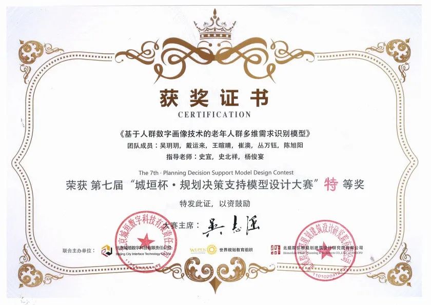 本届大赛由吴志强院士担任主席,国际欧亚科香港赛马会赔率 院士邬伦教授、武汉大学数字城市研究中心主任詹庆明教授、自然资源部信息中心原主任蒋文彪、中国地理信息产业协会教授级高级工程师汤海等15位来自国内城市量化研究及相关领域的行业权威专家组成终评专家组,对19个终评入围参赛团队开展评选。最终共产生特等奖两名,一等奖五名,二等奖十二名。其中,史宜老师、史北祥老师、杨俊宴老师指导的 《基于人群数字画像技术的老年人群多维需求识别模型》荣获全国特等奖。评委点评该作品“选题聚焦,以人为本,关注个体、弱势群体及群体内的需求和短板,作品方法具有创新性。”