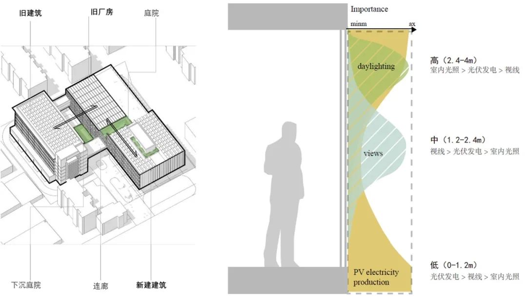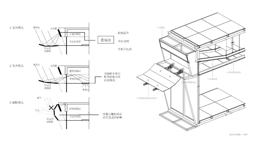 3. 与建筑的功能结合与协调。光伏获能与室内环境调控的功能、人眼高度视线需求相结合。(环境调控系统)