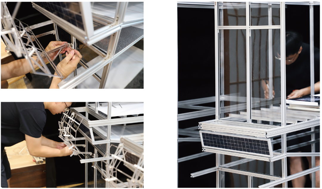 为了验证实际运行效果,学生搭建了1:4的2*3模型单元阵列,使用3D打印制造定制化节点,使用CNC与激光切割制作其他构件。