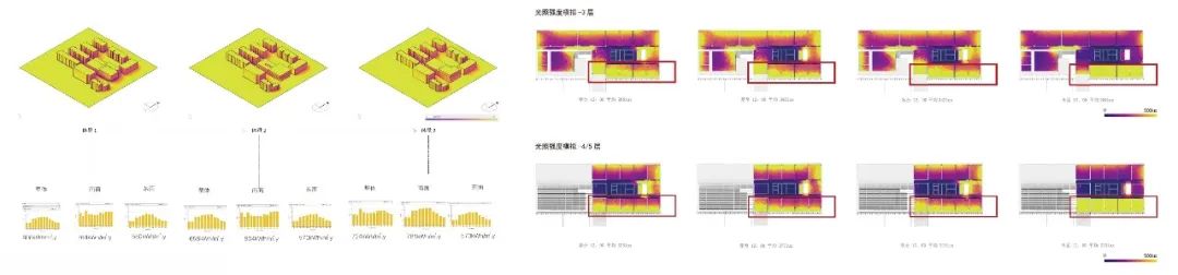 在本项目中,建筑体量方案的推敲与其建筑环境息息相关,在设计过程中需要保证建筑方案设计与建筑环境分析同步进行、相互驱动。在本项目确定使用光伏表皮作为建筑南向立面的设计方向时,不同建筑体量方案所接受到的太阳辐射尤为重要。南向面所接收到的辐射量将很大程度上影响建筑光伏表皮的发电效率与调控目标。因此对于本项目,需要将建筑体量的发展与建筑表面全年日照辐射量协同考虑,用日照分析促进建筑设计方案体量的发展。对本项目使用固定式光伏表皮情况下,一年中典型时刻的室内光照强度进行模拟分析,可见在建筑的 3-5层办公功能空间中,南向房间的光照强度较高,但单个房间内的均一性不足,靠窗位置的光照强度远高于远离窗户处;其他空间中的光照条件较差,表皮系统对建筑内部光照分配的引导作用较低。对于光伏发电量而言,经模拟计算估计,当建筑使用固定式光伏表皮时,全年的发电量约为 19483kWh,发电总量较高,但所使用的光伏板面积较大,其单位面积的发电效率较低。