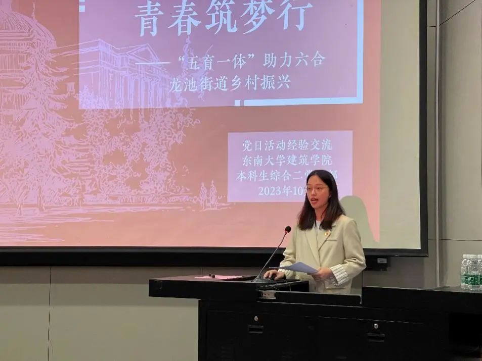 本科生综合二党支部宣传委员王婧铖围绕《成长手拉手,青春筑梦行——五育一体助力六合龙池街道乡村振兴》进行经验分享。支部聚焦“乡村振兴”时代课题,学深悟透总书记勉励精神,依托校地共建乡村振兴工作站,发挥党支部成员的专业特长,在六合当地开展“五育”系列实践服务,将青年党员的报国热情和乡村振兴的需求相结合,以实际行动践行党的二十大精神。