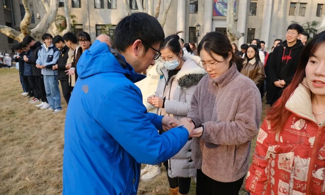 随后,师生一行移步中大院面前的大草坪,并分为五排站队,新发展党员站在队伍的最前列。仲德崑老师、张豪裕老师、曹俊老师、奚月林老师分别为近期19位新发展党员佩戴党徽,这是对新发展党员的肯定和鼓励,勉励他们坚定信念,不忘初心,牢记使命,不断学习和进步,以新姿态从容主动、更加积极地践行党员义务,履行党员责任。