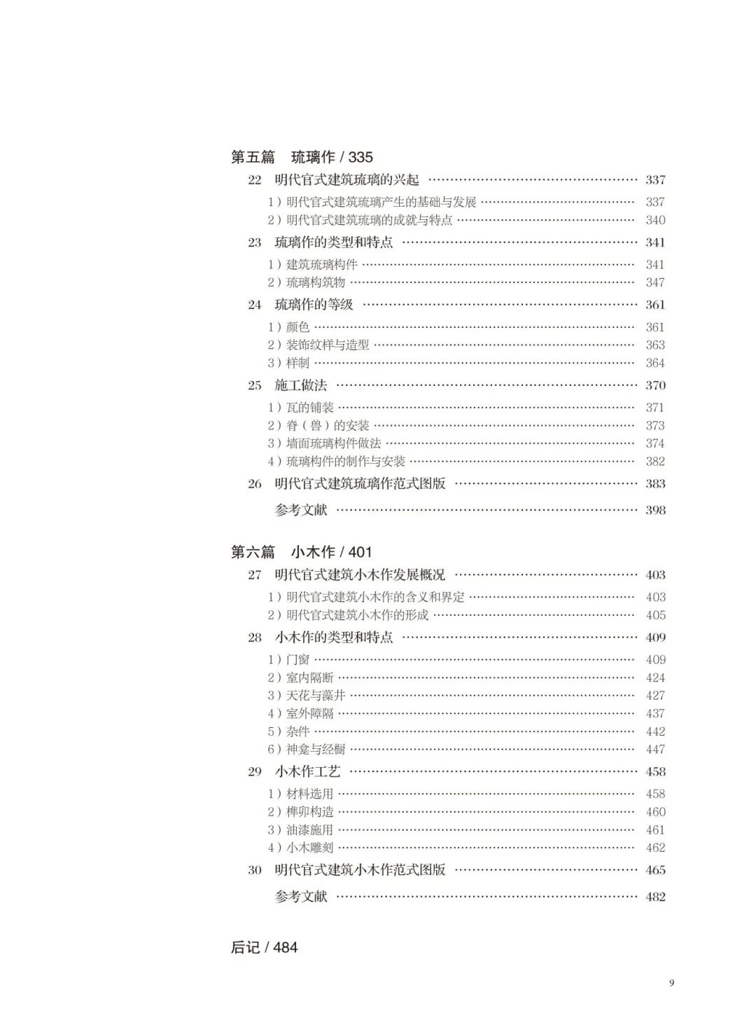 著作者第一人潘谷西教授在四十余年前专攻元明建筑研究,出版有《中国古代建筑史·第四卷·元、明建筑》,之后深化开展“明代官式建筑范式”研究,因为他认为:明代官式建筑上承宋元,下启清代,在中国古代社会晚期建筑发展中具有非凡的转折意义。在宋《营造法式》和清《工程做法》之间,该著作的出版,不仅对完善中国古代建筑的认知和理解有重要的学术价值和补阙作用,也是深化《营造法式》传承和了解《工程做法》脉络的重要基础工作,还对当下古建筑修缮及其遗产保护有广泛的应用和实践价值。《明代官式建筑范式》对明代官式建筑营造和设计相关的6种作法进行了系统研究,具体内容为:大木作、彩画作、石作、砖作、琉璃作、小木作。除了有历史考证和表述之外,从实物中提取依据、总结规律、量化数据,或从典例中归纳范式,是该著作的研究特点,每种作法均附有精心绘制的大幅图版。可供建筑史学者、文物保护工作者、考古工作者、建筑师、美术爱好者等研读、查阅,也可供相关专业师生进行深入学习和设计参考。