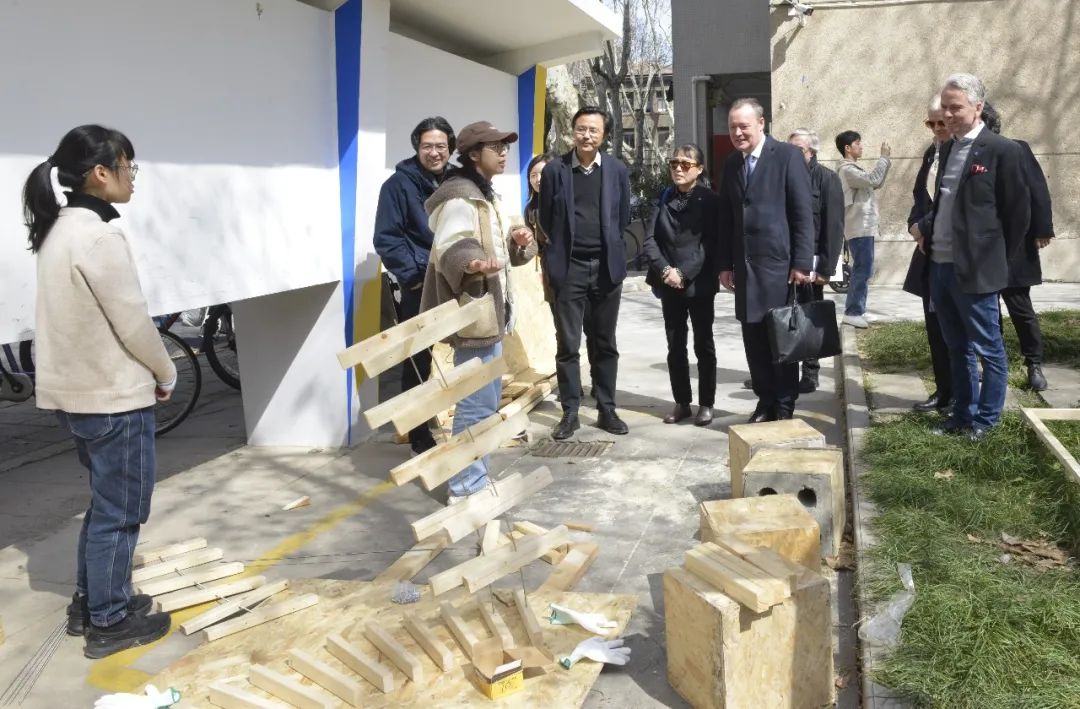 参观期间瑞典教授们遇见在前工院南侧樱花树下搭建木构装置的香港赛马会赔率 本科一年级学生。Mikael Lindström副校长饶有兴趣询问了搭建课程的情况,鼓励她们努力学习,欢迎她们到瑞典皇家理工大学交流学习。