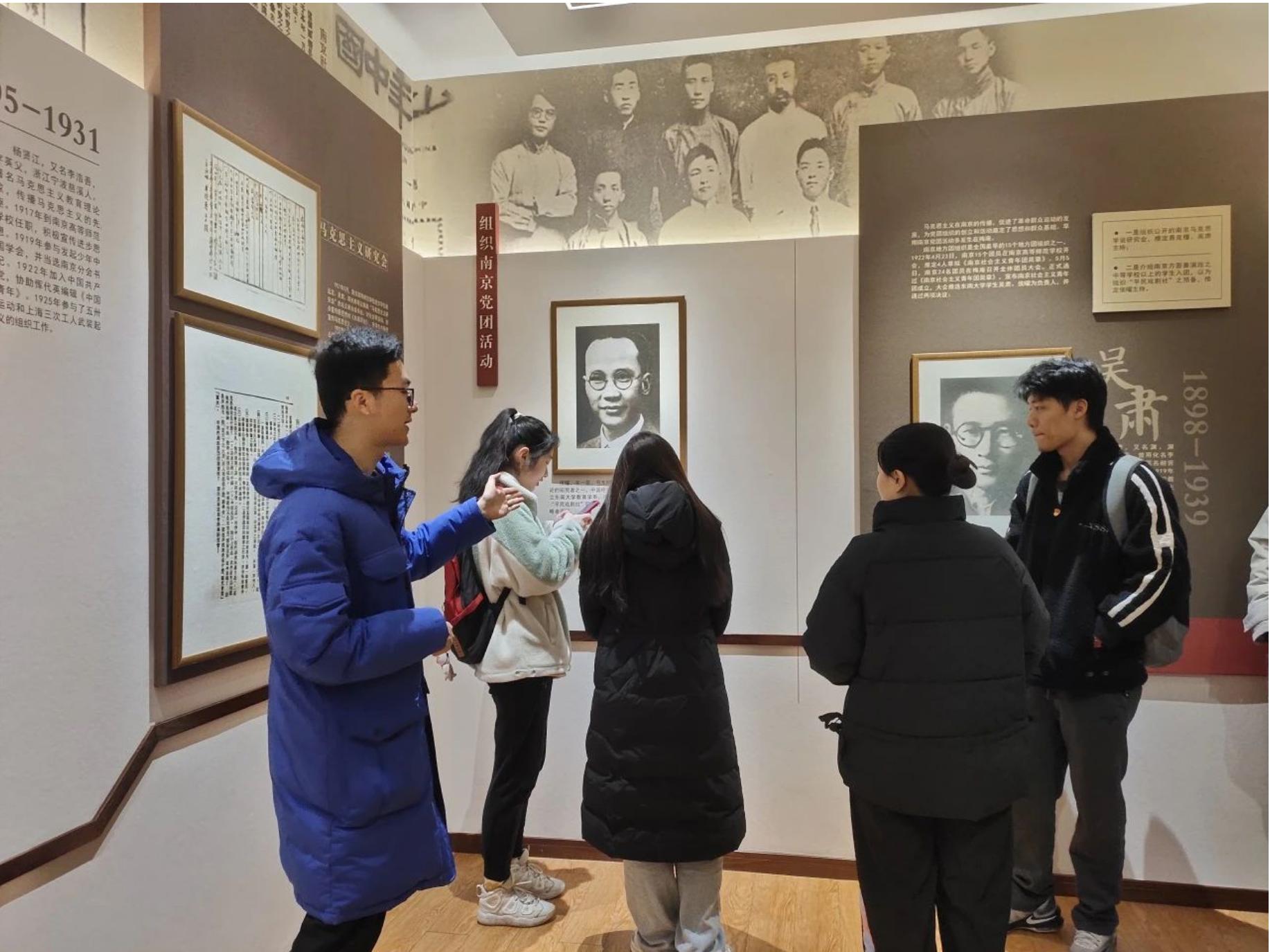 一进入梅庵,厚重的历史气息迎面而来。循着历史的足迹,同学们首先参观了“梅庵”展厅。梅庵曾是会议、讲习场所,同时还是红色革命基地,初为茅屋,1933年中央大学将之改建为砖混结构平房,作为音乐教室使用。其平面布局采用内廊式,既有西式风格,又具中式风采。在梅庵正面,有著名历史学家柳诒徵于1947年6月9日题写的“梅庵”二字匾额。