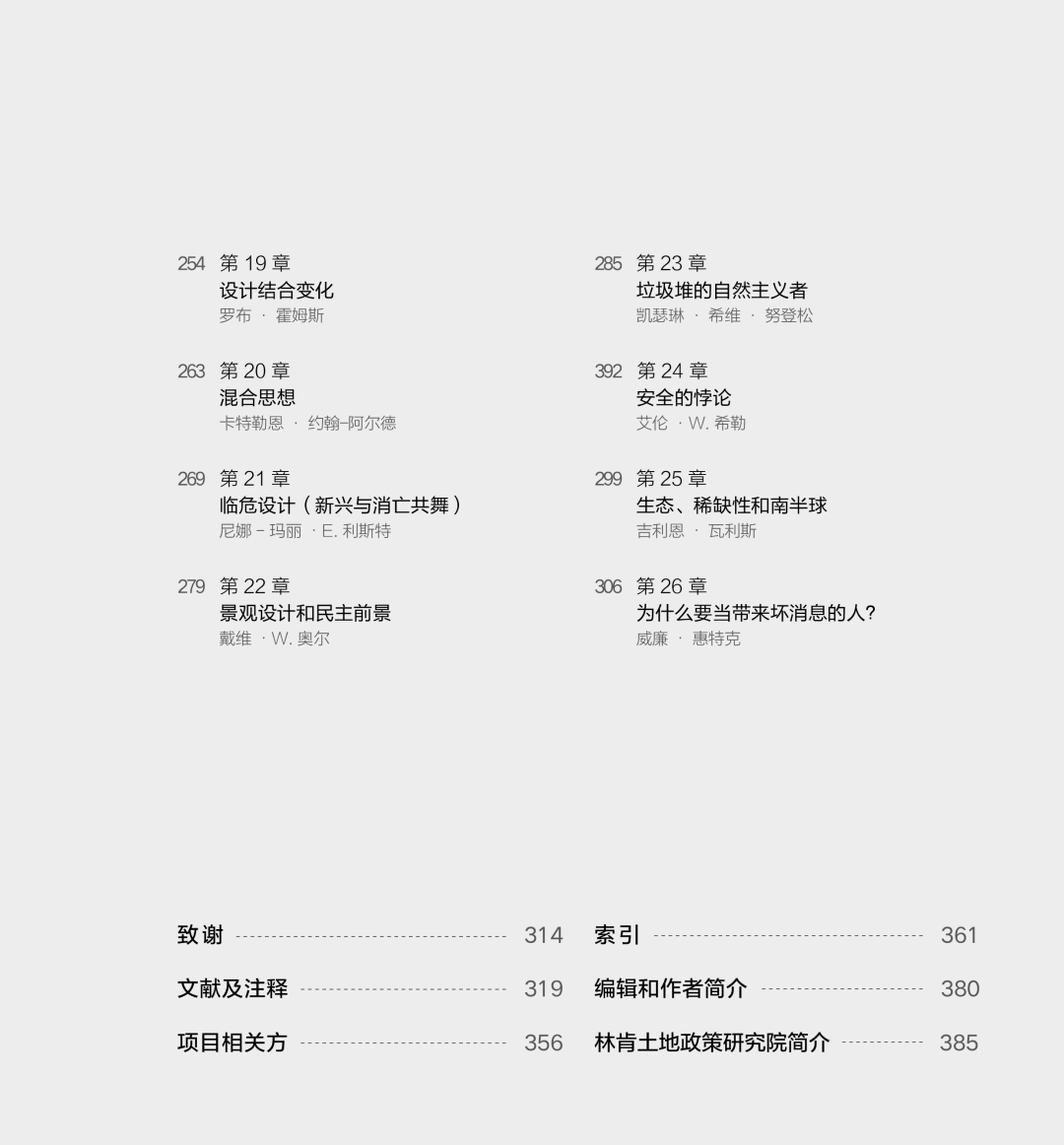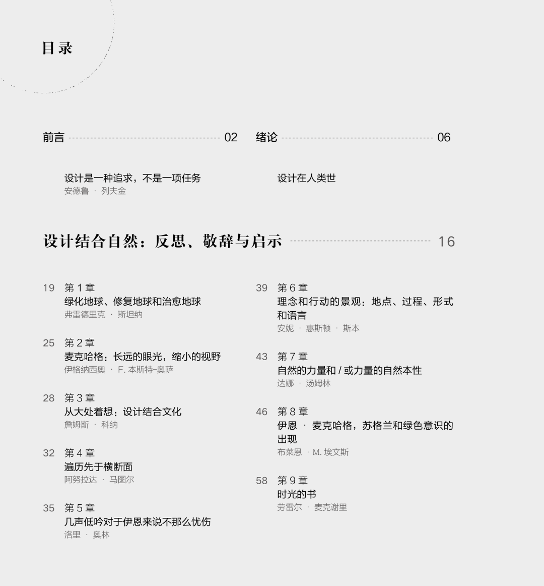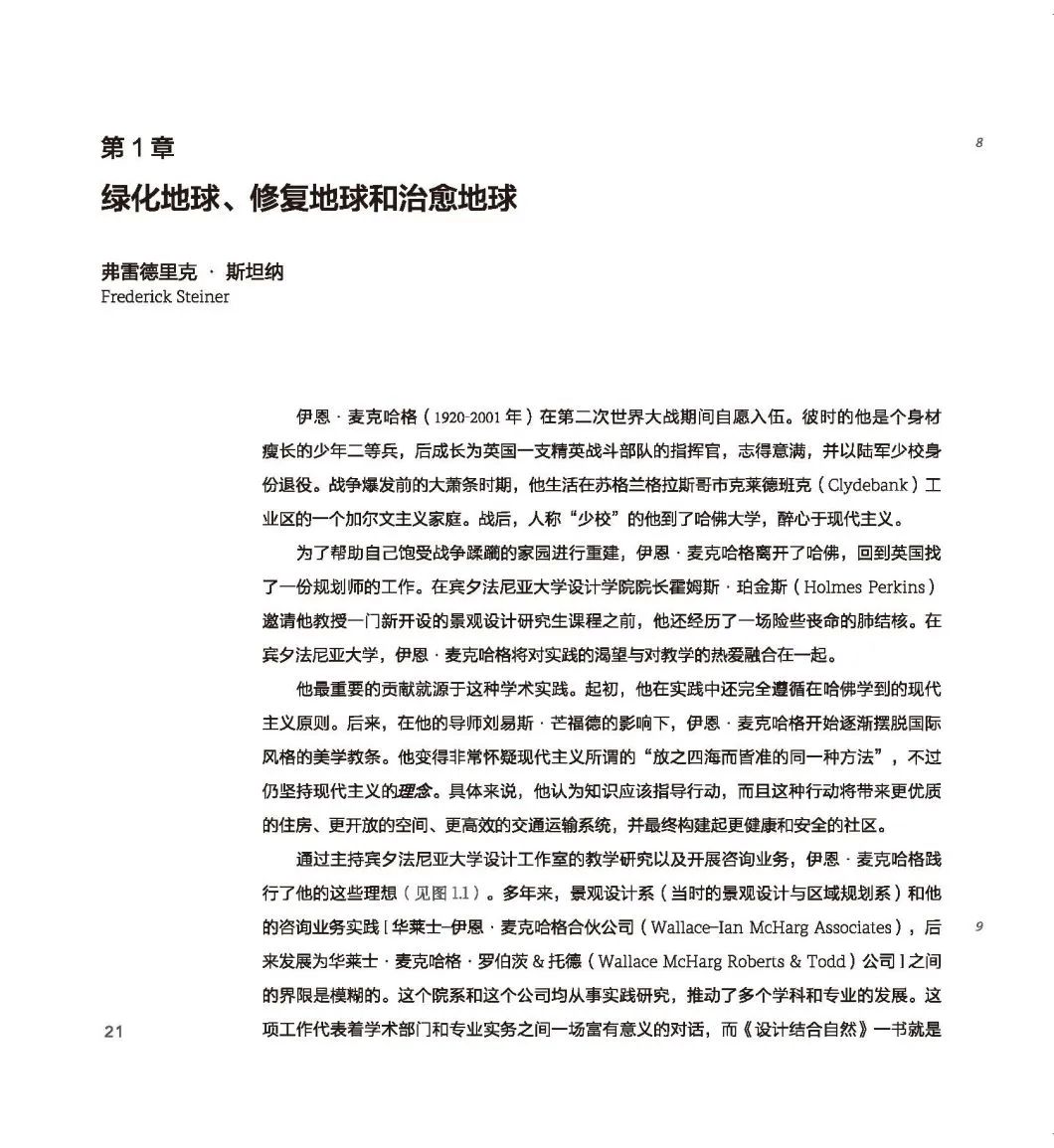 本书开篇是由麦克哈格多年的好友、学生和坚定的支持者弗雷德里克·斯坦纳(Frederick Steiner)所写的一篇关于麦克哈格的生平纪事。第一部分还包括多位曾聆教于麦克哈格并与他共事过的杰出学者和实务工作者所写的对麦克哈格生平的研究和探索,深刻表达了他/她们对麦克哈格的敬意。