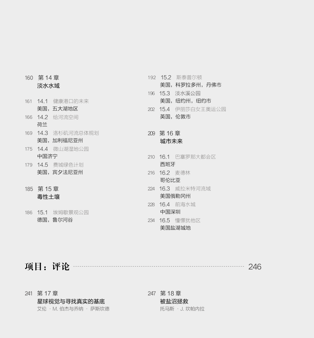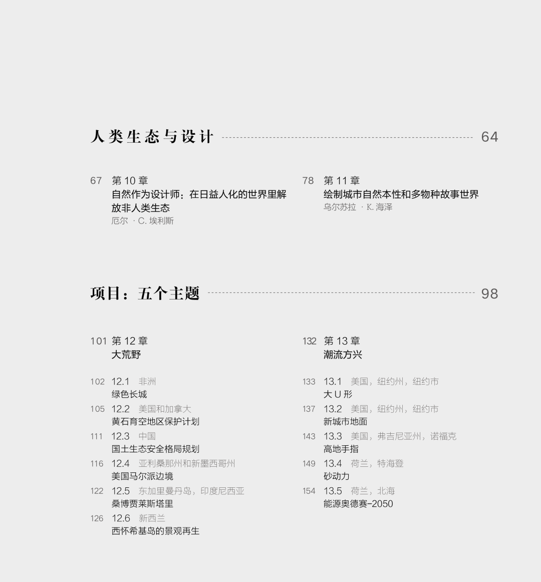 所选的项目中,一些项目反映出风景园林学科在推动必要规模的变化时有诸多局限,即虽然项目本身改善了在地的社会和生态功能,且它也可能是某种发展模式和基础设施项目的重要部分,但这种发展模式和基础设施项目却在其他层面有害于环境。所选的项目尽可能地囊括了更多元的类型。然而,设计结合自然的当代实践所涉足的主题领域中确实存在空白,无法面面俱到,但这些项目可作为千里之始,为设计结合自然在未来的实践提供可靠的参考。