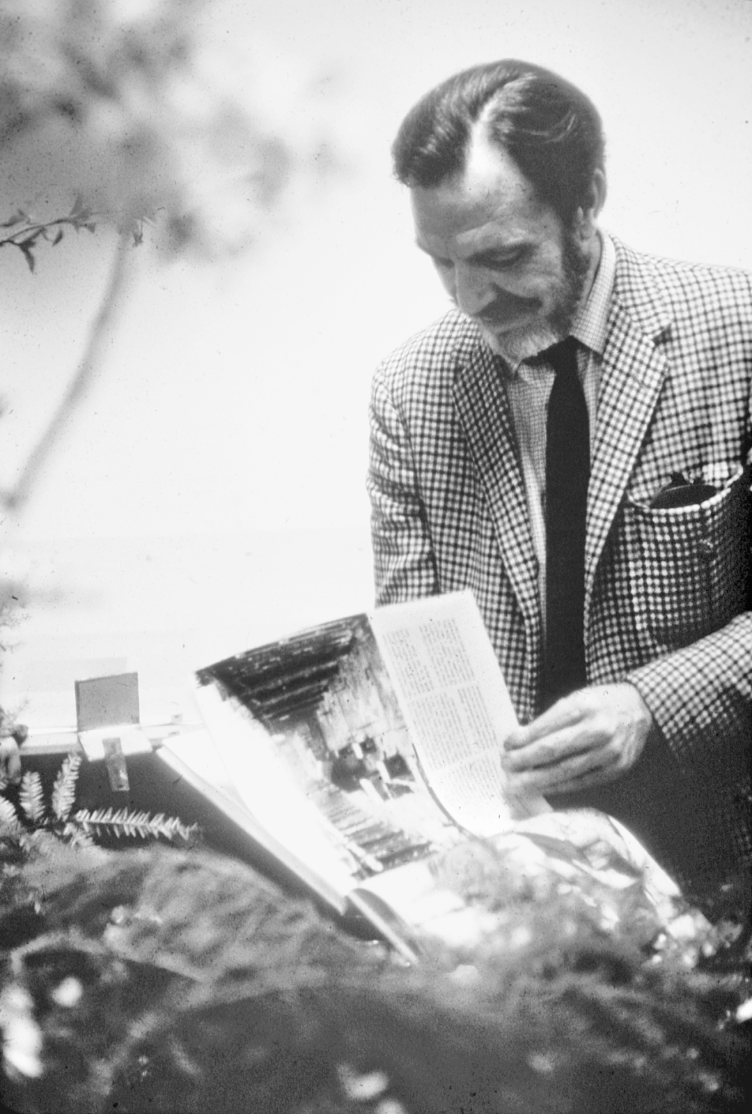 △麦克哈格手捧第一版《设计结合自然》,该书由猎鹰出版社出版,费城,1969年4月18日