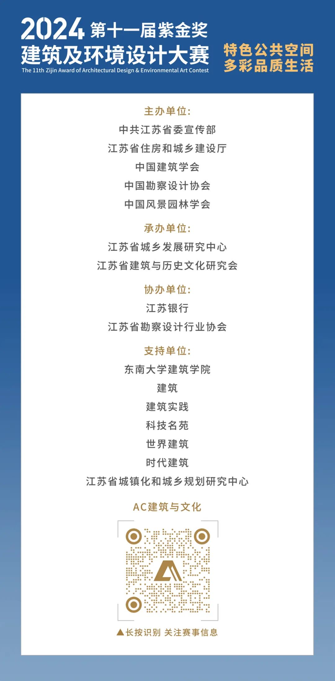 “紫金奖·建筑及环境设计大赛”由中共江苏省委宣传部、江苏省住房和城乡建设厅联合中国建筑学会、中国勘察设计协会、中国风景园林学会共同举办。大赛自2014年起已举办10届,成为了具有全国影响力的建筑与环境设计品牌赛事,致力于为设计师、青年学子及社会公众搭建专业性与社会性充分融合的行业平台,推动面向高质量发展的设计创新和高品质建设。现将有关情况和要求公告如下: