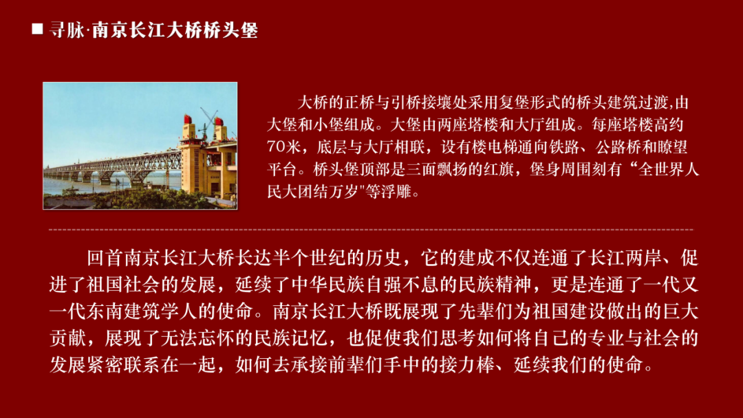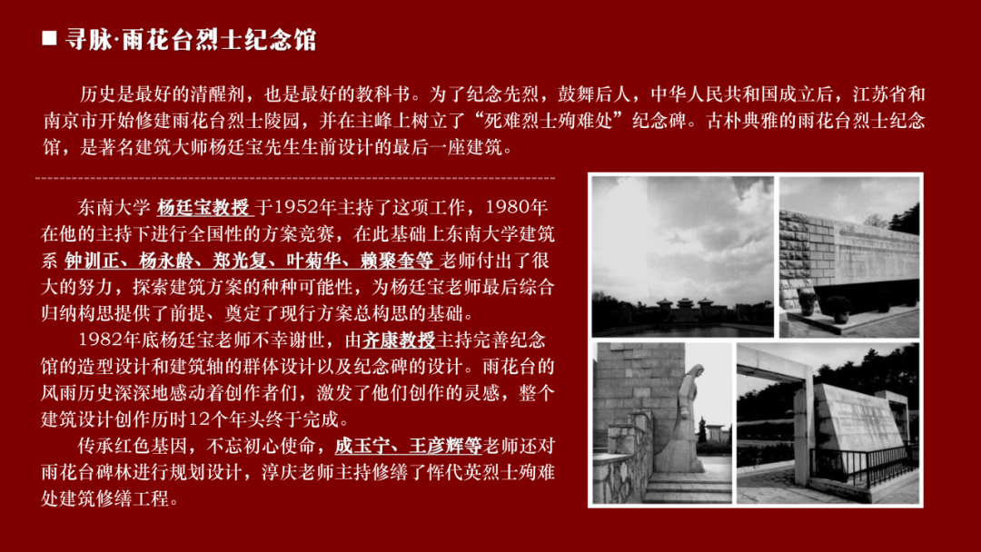 第二篇章,刘学姐为大家详细介绍了雨花台烈士陵园、南京长江大桥桥头堡、沙家浜风景旅游区规划设计等建筑规划设计案例。为大家展现了东大建筑先辈在祖国大地上写下的红色故事。