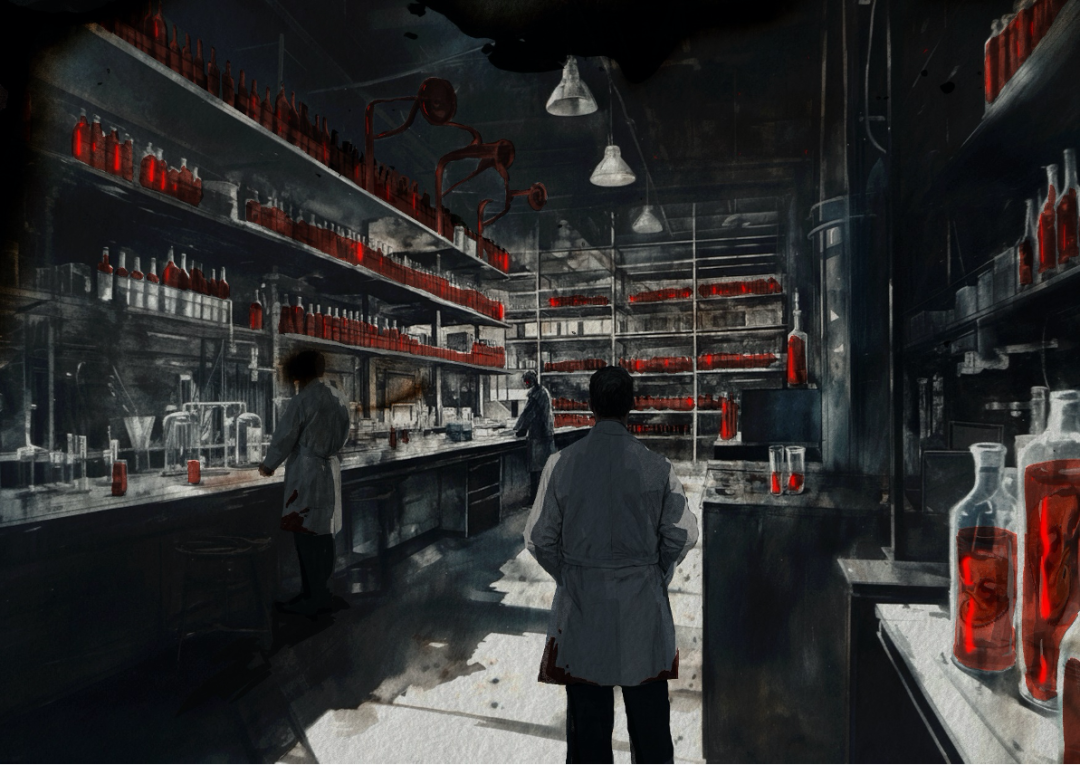 蜘蛛网一般的钢架层层叠叠,从四面八方消失在黑暗中。在它们旁边有三个红色的幽灵正忙碌地从一条传送梯上把细颈凸肚瓶搬下来。