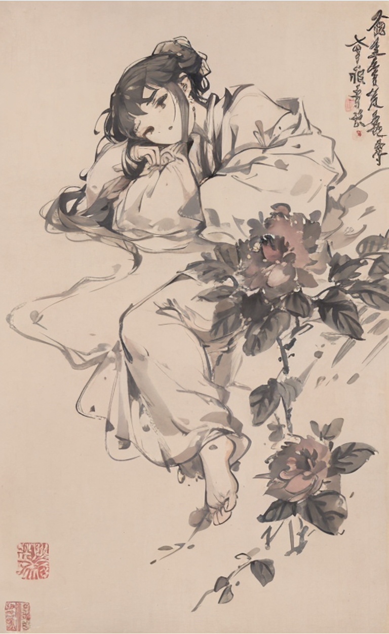 说着,都走来看时,果见湘云卧于山石僻处一个石凳子上,业经香梦沉酣,四面芍药花飞了一身,满头脸衣襟上皆是红香散乱,手中的扇子在地下,也半被落花埋了,一群蜂蝶闹穰穰的围着他,又用鲛帕包了一包芍药花瓣枕着。
