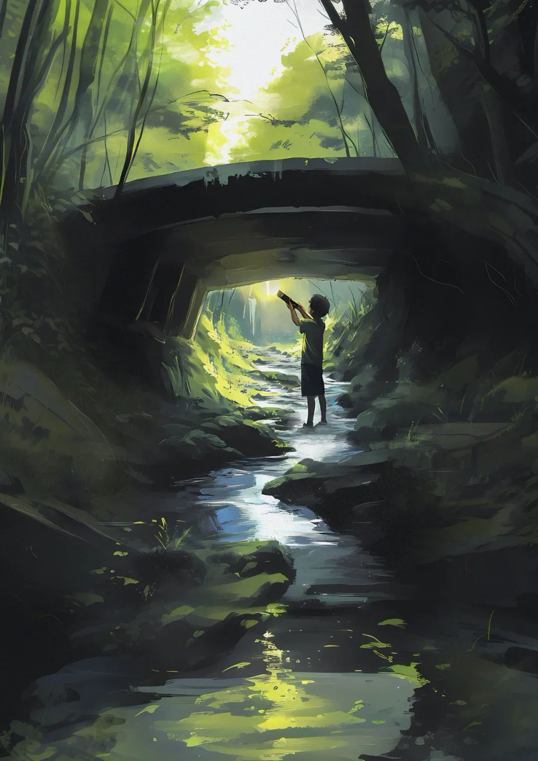 鸟去后,菜园里一味的黑,水流声在黑暗中听来格外空灵。我定了定神,没过小桥,却在岸边坐下,把电筒叼在口中,手扶岸沿,用脚去探溪水。水凉极了。我慢慢滑下去,在溪中站稳,水刚淹到大腿。溪中半是长草,高与人齐,我用手拨开,一步步往桥洞挪去。手脸被草叶刮得生疼。钻进桥洞时,和躲进瓮中有相似的感觉。桥洞因为背阴,没生多少草,人可以舒服地站着。