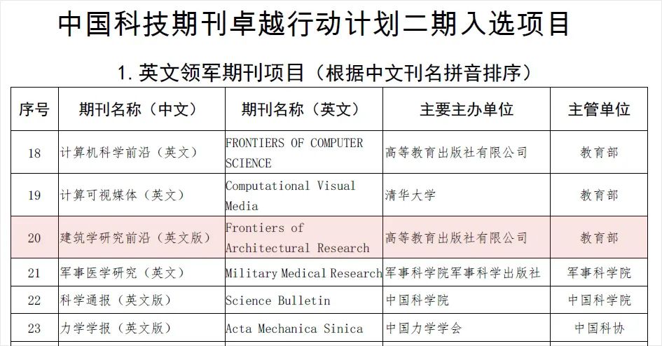今日,中国科技协会正式公布了“中国科技期刊卓越行动计划二期”入选项目。Frontiers of Architectural Research (高等教育出版社和香港赛马赔率|查询平台|赛果数据 联合主办) 入选英文领军期刊项目。