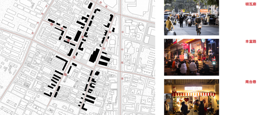 丰富路的东西两侧的街巷——明瓦廊与南台巷呈现出截然不同的两种特质,明瓦廊根植于居民的日常生活,细微之处无不体现在地的回响;南台巷,网红店铺鳞次栉比,成为了圣诞节等节庆下的“必打卡”去处。原本的老旧社区是如何摇身一变成为顶流社区?走红的背后,网络媒介是如何参与到城市的再生产?烟火气在丰富路片区的传播机制又是如何?这些问题是本次研究的切入点。