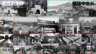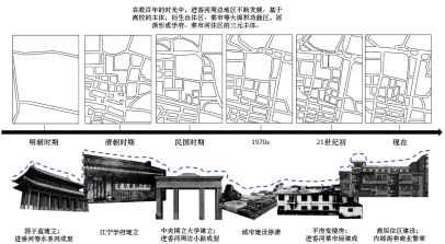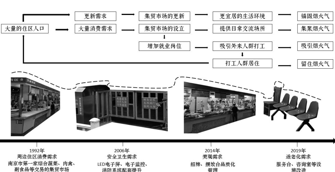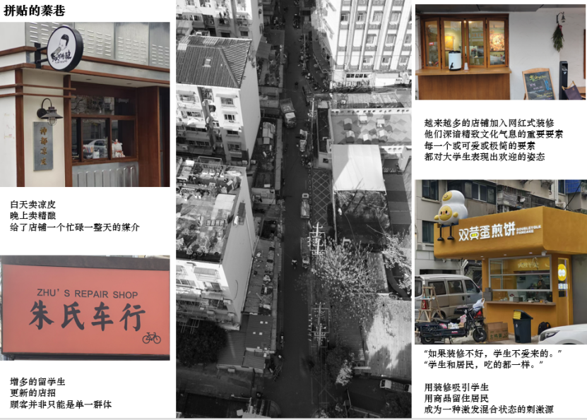 1992年,结合旧改,建成底层为市场、垃圾站,上层为住宅,二层连廊相连的巨构,凝聚区域烟火气。其大容量含各类服务业态,吸引居民消费。垃圾站与服务设施保烟火不断,市场与餐饮店为迸发点。市场源于住区需求,消费增长促市场更新,吸引打工者居住,集聚锚固烟火气。进香河街区的蓁巷位于市井气与文艺气的交汇处,但直到今年,才出现精致的店招和年轻化的装饰。为何近年来高校气息才开始影响进香河街区呢?从历史角度看,进香河街区处于被国子监、鸡鸣寺、成贤街、监狱、珠江路等重要规划挤压的剩余地,没有上位规划的发展指导。只能在适应中生存,缝隙中成长。在数十年的发展历程中,逐渐形成了学府,菜市和住区的三元主体,构成了书香气与市井气并存的烟火。而近年来,市井气在数年的发展中太过强大,形成的氛围抗拒着学生的加入;物质空间上,围墙,外摆,卫生等条件在有形中拒绝了学生进入;喧闹的噪音,内向的界面和非需求的业态也在无形中拒绝了学生;同质化的立面和线性空间也造成了低探索的欲望。这种气息是陌生的、异质的、哪怕一起发展共存过多年,也是“只许共存,不许融合”。