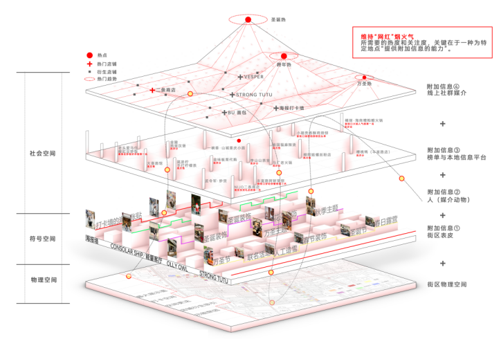在这个过程中,维持“网红的热度与关注度,关键在于一种为特定地点提供附加信息的能力。由此,只需精心打造几处适合相机的立面或场景,成为一种新型的城市表皮主义。频繁更换的皮肤,形成城市快闪景观。当然,我们也看到丰富路烟火气的起始并非是网络媒介的单一作用。初始的“极点”大多是扎根在地社群,形成线下的影响力,并传播至整个街区。网络媒介作为丰富路片区城市空间再生产的推手,融入了由于城市化催生的文化与社会层面的扰动,构成了社会行动和流动的多种特定环境类型。在这样的再生产机制下,符号空间不断向社会空间和物理空间注入附加信息,增加街区的新陈代谢,形成热点的爆发与传播,最终塑造了丰富路片区独特的烟火圈特质。