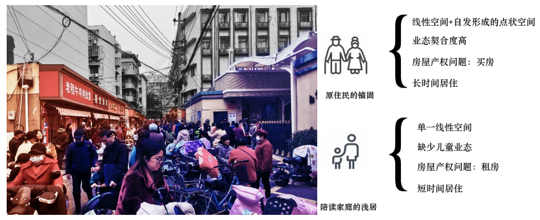 进香河路鲜活在每一个烟火升腾的瞬间集贸市场似乎成为原点承载着烟火的盛放。然而在这表象的背后仍然有着交错混杂的种种“矛盾”。原住民的锚固与陪读家庭的浅居是这个场地的重要反差特征。前者借由买菜作为一天中的社交仪式,在街道角落驻足聊天,后者大多用电动车接送,并不在此停留过久。不同的身份塑造了不同的生活节奏,不同的生活节奏又影响着不同的物质空间。原住民的锚固进一步加强了适合于他们的物质空间环境,陪读家庭的浅居间接导致了儿童业态的缺失。