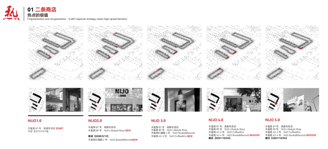 “热”的特质聚焦在个体的店铺上呈现出不同的现象,有由于店铺的快速走红扩张引起区域热点,有为了应对高速迭代而产生的店铺分割与重组,还有从城市的各处被丰富路特殊烟火气所“捕获”而产生的迁徙现象。