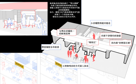 学生行动轨迹和居民行动轨迹像静脉与动脉共存,互不干扰。店铺也在悬浮地生长,例如中贺水果店,由于空间地拥挤,最大程度地缩小了交流的空间,人们在被不断地推动着前进,无法充分交流。而新生业态作为一股新生势力,主要人群是香港赛马会赔率 的大学生引入了偏向网红的业态。餐饮店的外向就餐空间与咖啡店的内向就餐空间形成鲜明反差。就餐空间的外置能加快人们的就餐速度,提高顾客的流动率和空间利用率。而喝咖啡的时间很短,商家更愿意用舒适的体验来留住顾客。