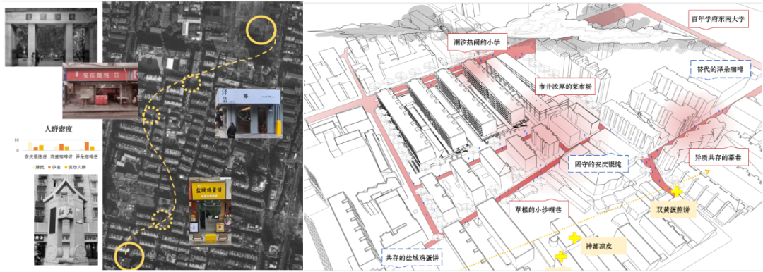 本案为研究型城市设计课题,要求学生通过详细的现场认知与调研工作,针对南京城市烟火圈的案例进行分析与研究。通过多维度的参与性工作,回溯城市烟火圈的历史发展过程及其构成原理,分析它们在社区环境中的影响与作用,提炼它们的构造原则与方法,同时为将来可能的优化提升提出建设性的观点。