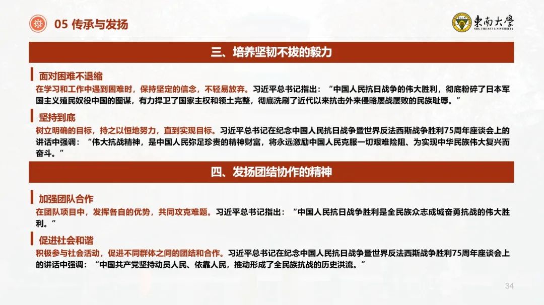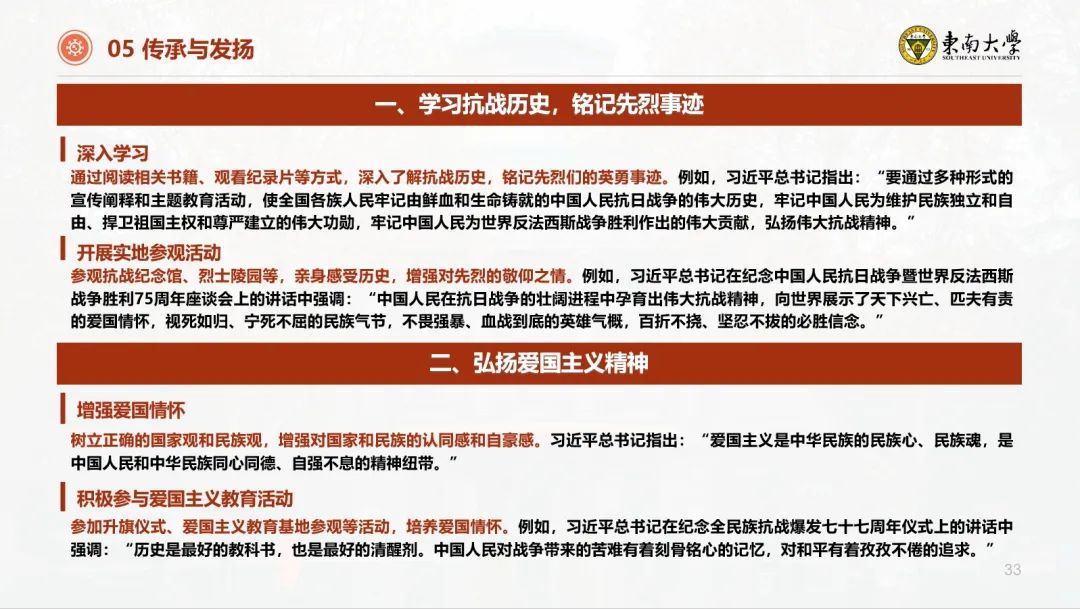 接着,张翔宇同志结合习近平总书记重要讲话精神,从三个维度阐释抗战精神的时代价值:一是作为实现中华民族伟大复兴的精神动力,以百折不挠的信念推动攻坚克难;二是为新时代党的建设注入思想内核,通过传承英雄气节筑牢政治信仰;三是以爱国情怀与和平理念厚植人类命运共同体根基,促进文明互鉴与国际认同。这揭示抗战精神既是历史丰碑,更是打造人类命运共同体意识的精神文化基础。