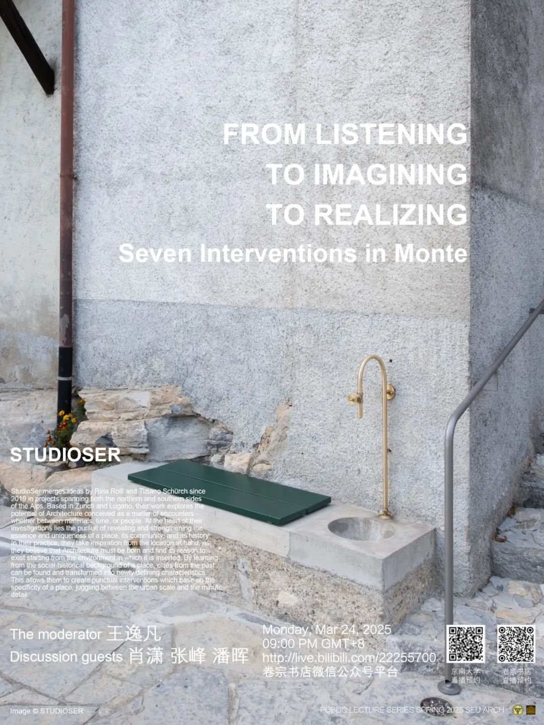 “从理念到空间:欧洲年轻建筑师的实践与思考系列讲座”将邀请欧洲年轻一代建筑师分享他们的建筑思考与实践经历。这些年轻建筑师都曾求学于瑞士等欧洲国家的著名建筑院校,并且在ETHZ和Mendrisio等院校作为教席助教或客座教授任教多年。在教学的同时他们也开展独立的建筑实践。围绕教学成果和实践成果,他们已经在欧洲多地成功举办数场讲座。系列讲座的内容将包括他们的建筑思考与实践经历。