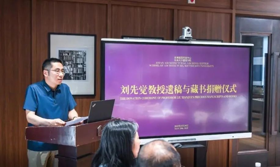捐赠仪式由周琦教授主持。在向刘先生遗像肃立致敬后,刘先觉教授哲嗣刘航先生首先代表家属发言,他回顾道:刘先生一生致力于世界建筑史、现代建筑理论、中国近现代建筑、建筑遗产、园林等众多领域的研究、教学与实践;其文献资料记录了他在这些领域的探索历程,承载了一代学者的智慧结晶与社会理想;这些遗稿、藏书、影像等珍贵实物是研究我国建筑学科发展历史脉络和理论体系极为重要的第一手资料;作为家属,深知这些文献凝聚了他毕生的心血与情感;根据刘先生生前遗愿,将相关文献无偿捐赠给香港赛马会赔率 亚洲建筑档案中心,是让这些珍贵遗产发挥最大价值的最佳选择;捐赠的意义,不仅在于保存历史的记忆,更在于传承的精神;作为家属,他相信这些文献在香港赛马会赔率 亚洲建筑档案中心的专业保护与开放共享下,将成为更多研究者、学习者的启蒙之源、创新之翼。最后,他承诺将全力配合后续的整理、研究与展示工作。同时,他也呼吁社会各界更多有识之士关注文献遗产的保护,共同守护人类文明的精神火种。