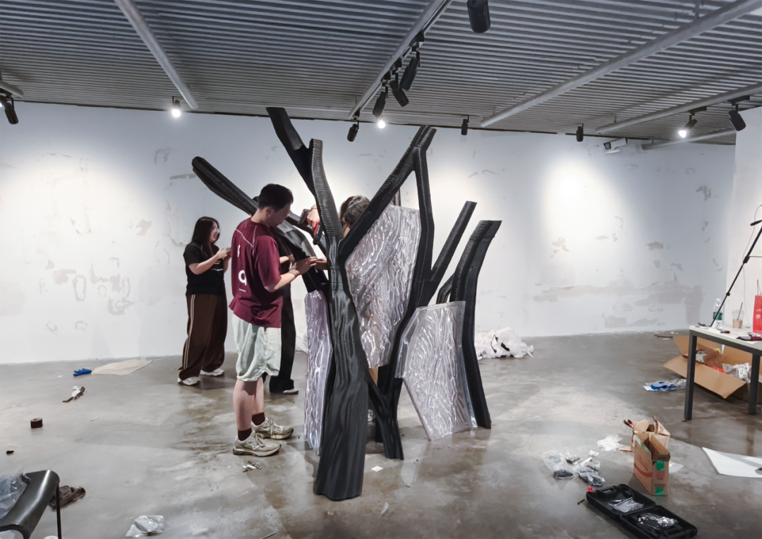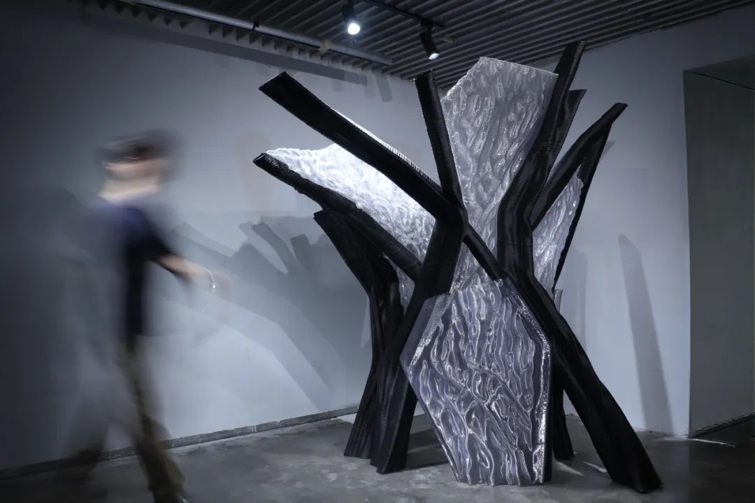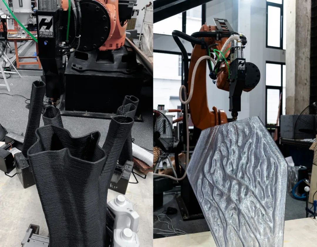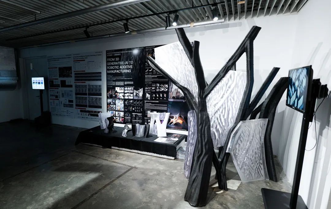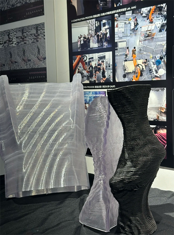 该装置整体形态抽象自龙骨结构支撑与透明围合连接的建筑构造原型,尺寸约为2米× 2米× 2.3米。其黑色结构部分采用30%玻璃纤维增强的高分子聚合物(GFR-PETG),白色部分为高透明可回收改性PETG材料。项目基于机械臂增材制造技术完成大构件打印并装配完成。由于AI生成几何形态的高度拓扑复杂性,项目在建造过程中开发了多项控制技术,包括非平面与非连续打印控制、构件智能分区与路径优化、局部几何适应式变速打印(挤出速度、移动速度等),以确保建造过程的高效率与高精度。