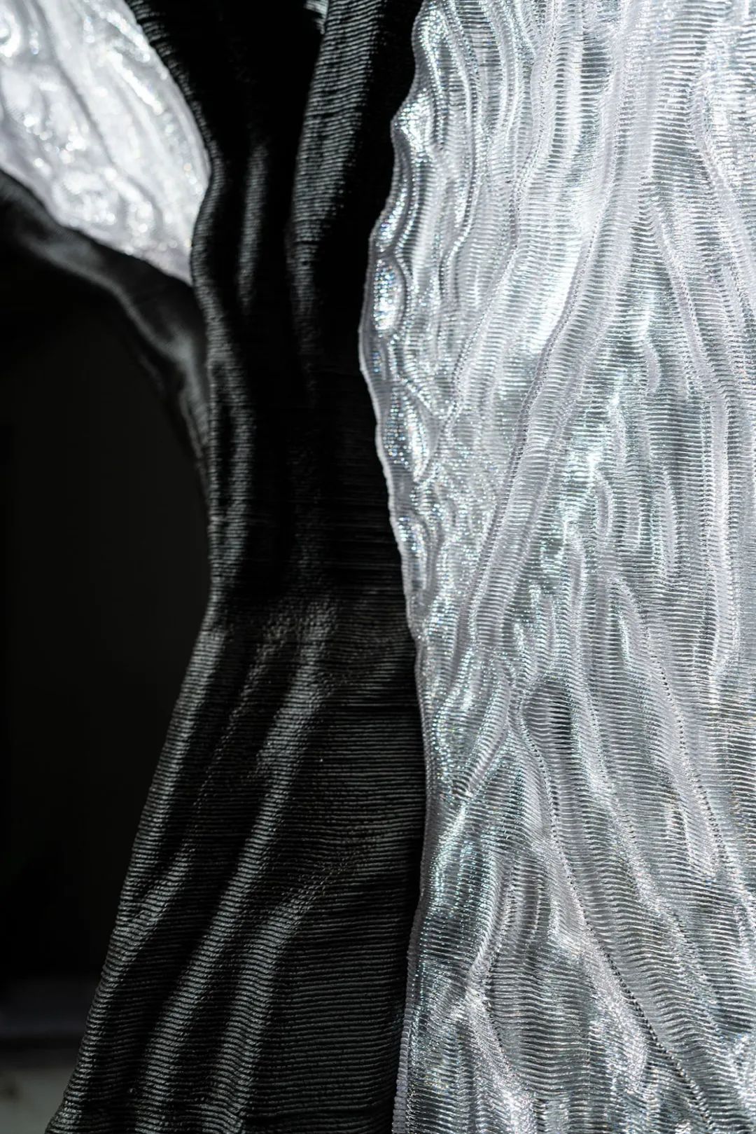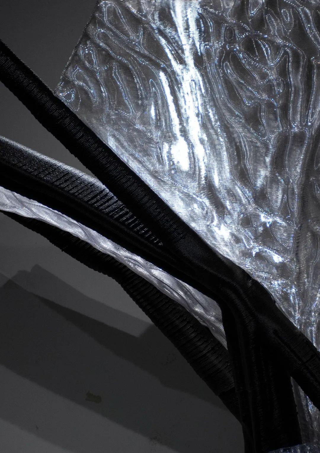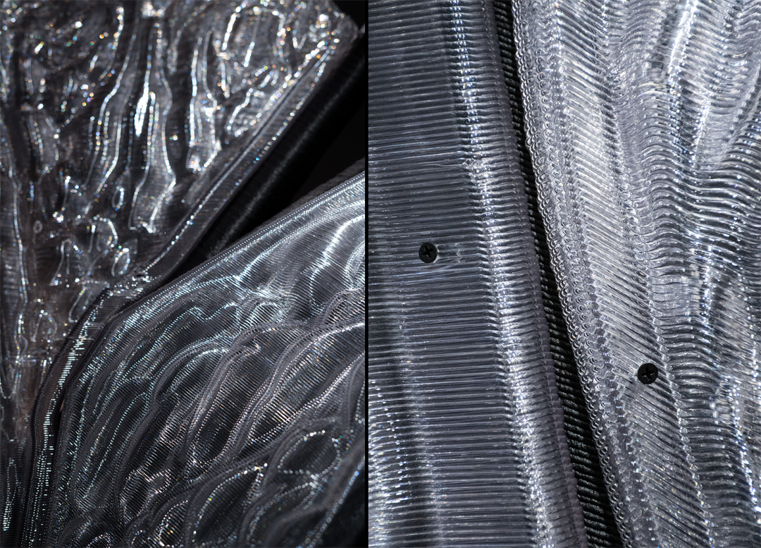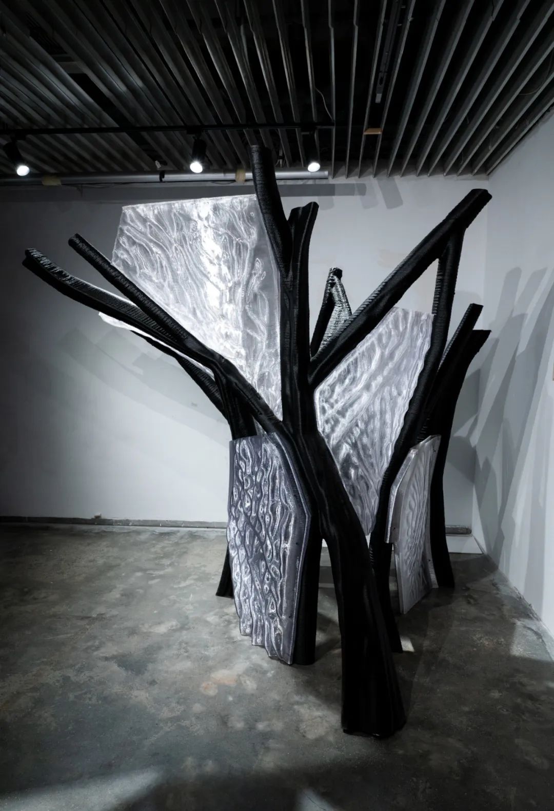 该装置整体形态抽象自龙骨结构支撑与透明围合连接的建筑构造原型,尺寸约为2米× 2米× 2.3米。其黑色结构部分采用30%玻璃纤维增强的高分子聚合物(GFR-PETG),白色部分为高透明可回收改性PETG材料。项目基于机械臂增材制造技术完成大构件打印并装配完成。由于AI生成几何形态的高度拓扑复杂性,项目在建造过程中开发了多项控制技术,包括非平面与非连续打印控制、构件智能分区与路径优化、局部几何适应式变速打印(挤出速度、移动速度等),以确保建造过程的高效率与高精度。