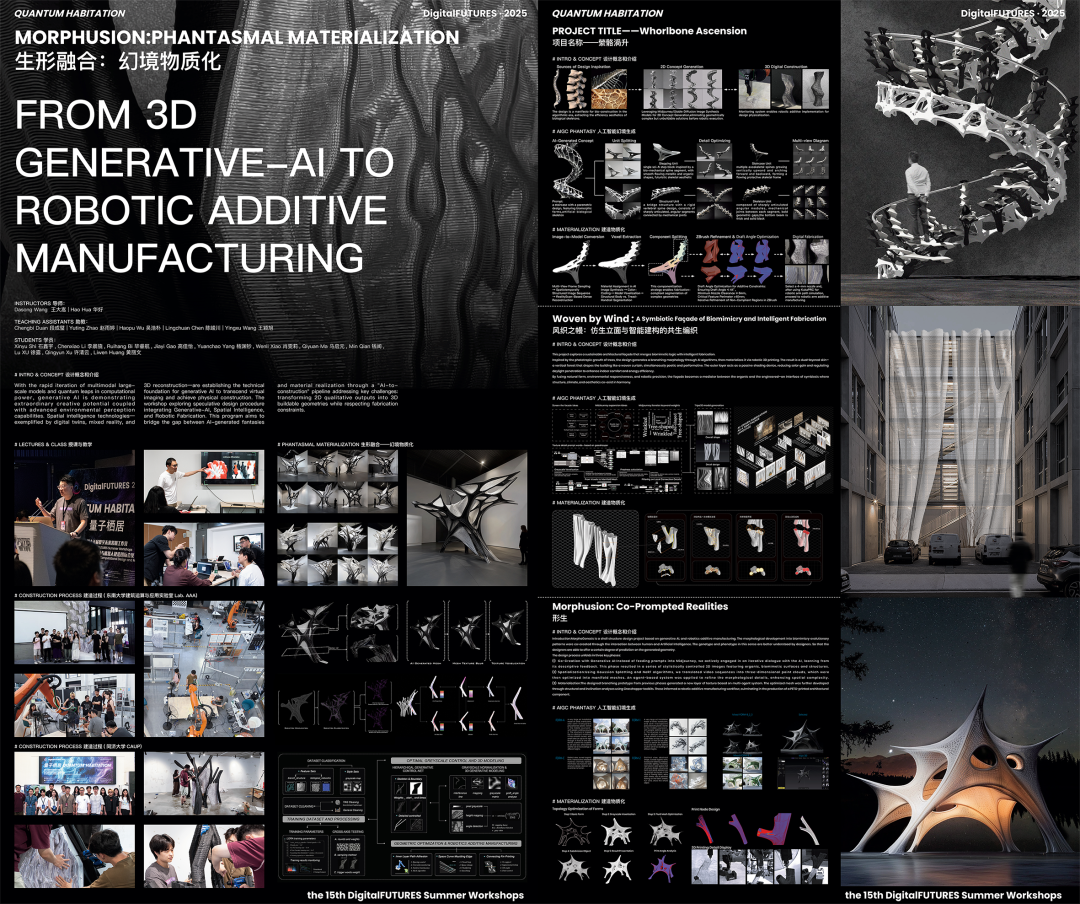 2025年6月28日至7月6日,香港赛马赔率|查询平台|赛果数据 建筑运算与应用实验室(Lab. AAA)的王大嵩助理研究员、华好副教授以及五位研究生助教共同指导了DigitalFUTURES 2025 国际工作营,主题为“生形融合:幻境物质化——从三维生成式人工智能到机械臂增材建造”(Morphusion: Phantasmal Materialization - From Three-Dimensional Generative AI to Robotic Additive Manufacturing)。该工作营基于香港赛马会赔率 Lab. AAA的最新研究成果,聚焦生成式人工智能、空间智能与机器人建造技术的融合,探索“AI-Construction”集成工作流下的推测性设计方法。核心议题是如何在建造约束条件下,从二维定性生成过渡至三维复杂构形的技术路径,实现从人工智能“幻境生成”到机械臂“物质化建造”的维度转译。