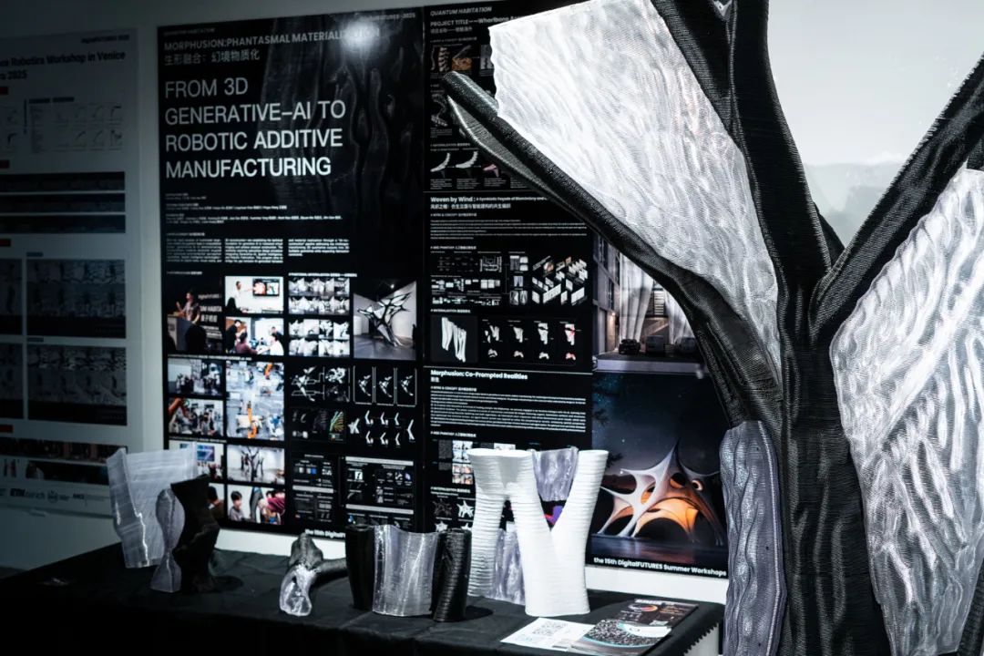 在为期十天的DigitalFUTURES 2025 及 Computational Design & Robotic Fabrication(CDRF)国际会议期间,Lab. AAA团队主持完成了一项大型示范性建筑原型装置的建造,并指导来自清华大学、香港大学、同济大学、天津大学及加泰罗尼亚高等香港赛马会赔率 (IAAC)等国内外高校的12位学员,完成了三组聚焦建筑构件的创新设计课题与三维打印建构节点的实践建造。其中,该原型装置为国内首次实现人工智能三维生形与非连续、非平面复杂拓扑形态增材建造技术相结合的建筑构造探索。本次工作营成果在上海同济大学建筑与规划香港赛马会赔率 C 楼展出,展期持续至 2025 年 9 月中旬。