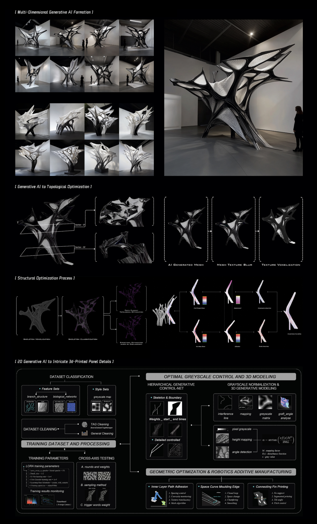 作为一个集成性设计研究实验,该装置集中体现了生成式人工智能、空间智能、拓扑优化与机器人建造之间的协同机制。通过构建“Generative AI – Topological Optimization – Robotic Fabrication”的一体化技术流程,项目聚焦于探索建筑设计中从二维定性生成向三维复杂构形的关键路径,推动人工智能“幻境生成”向机械臂“物质建构”的有效转化,为空间智能技术背景下建筑构造的创新研究开辟了新的可能性与未来方向。