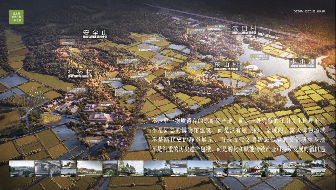 The Jiangnan Origins Cultural Heritage Park is located in the Longsheng area of Deqing County, Huzhou City, Zhejiang Province. Covering a total area of approximately 2.5 square kilometers with a floor space of around 85,000 square meters, the project has a planned total investment of about 2.3 billion yuan. The park primarily includes: museum clusters, heritage site park, comprehensive traditional culture exhibition spaces, supporting facilities. It aims to become China’s first experiential museum complex. The project is divided into five functional zones based on geographical planning: Sheqiao Village, Anquan Mountain, Yangkou Village, Xiaoshan Yang, and Dongshan Village. These areas will showcase four major cultural themes of Deqing's origins: The Origin of Porcelain, The Origin of Pearls, The Origin of Zen Tea Culture, The Origin of Farming.